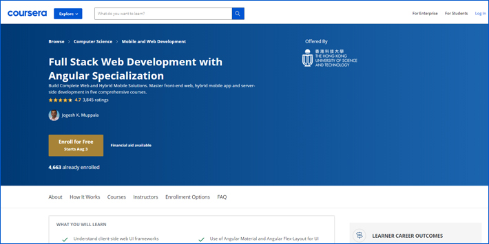 | Full Stack Web Development with Angular Specialization | 4490 | 4.7 and 3839 ratings |